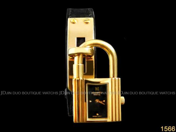 【品名】 | HERMES 愛馬仕 Kelly系列 金色鎖頭造型石英女錶 | 【型號】 | | 【新錶價】 | 121000元 | 【特價】 | 28800 元 | 【機芯】 | 石英機芯 | 【品相】 | 80%成新 無-附件 | 【材質】 | 精鋼鍍金材質鎖頭錶殼&錶扣&指針/黑色小牛皮錶帶/藍寶石水晶玻璃鏡面/黑色面盤 | 【功能】 | 經典鎖頭造型錶殼/時針.分針二針時刻顯示/按壓式錶冠/立體圓點時標/日常生活防水/錶徑:20mm(寬)*38mm(高)*9mm(厚)/適合手圍17cm以下配戴 |