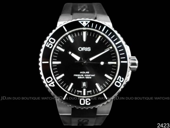 | ORIS 豪利時 2423 Aquis時間之海系列43.5mm黑色陶瓷圈潛水300米自動上鍊男用腕錶 |