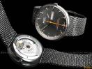 [材質] 精鋼鍍PVD材質錶殼&錶帶&錶扣/白色螢光指針與整點時標/煙煤色太陽放射狀緞面絲光紋面盤/藍寶石水晶鏡面/亮橙色點綴指標與秒針